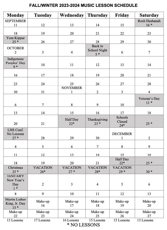Length of semester depends on day of the week of the lessons as noted below. Each student is permitted only one personal excused absence per semester and is urged to give the teacher 24 hours notice when possible. The only other approved reason for a missed or cancelled lesson is school cancellation, teacher absence, or conflict with a required school event.